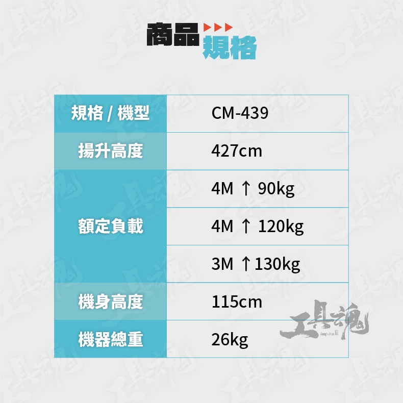 額定負載:4m以上→90kg / 3m~4m→120kg / 3m以下→130kg