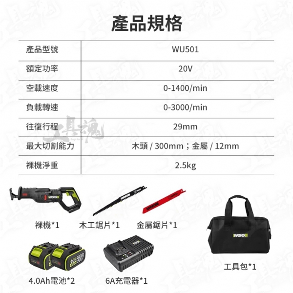 主機*1、4.0Ah電池*2、6A充電器*1、金屬鋸片*1、木材鋸片*1、工具包*1、使用說明書*1、保修卡*1
