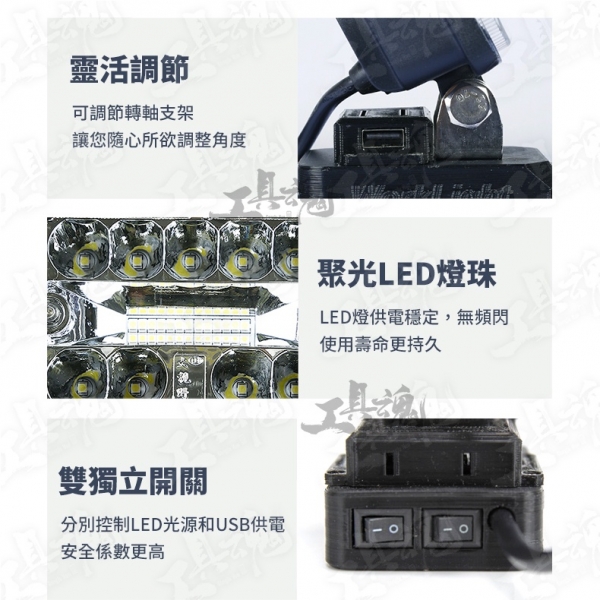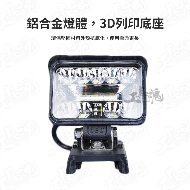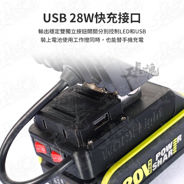 ※本商品不包含電池 ※USB接口不可直接用來啟動工作燈,還是需要裝上電池才能啟動工作燈唷 ※USB接口的功用為:裝上電池使用工作燈同時,也能替手機充電 【產品規格】 燈珠:22顆 亮度:2400LM 功率:15W(4.0Ah電池約可運作5小時) 底座材質:3D列印 燈外殼材質:鋁合金 底座輸出保護電壓:15V 待機電流:10MA 【USB快充參數】 輸出電壓:預設5V,開始快充後在3.12V之間自動調整 輸出功率:(24W(5V@3.4A,9V@2.5A,12V@2A等) 轉化效率:90%-97% ※此賣場提供 "有USB充電孔"及"無USB充電孔" 兩種款式的工作燈 【商品特色】 輸入過流保護 / 輸入過壓、欠壓保護 / 整機過溫保護 / 輸出過流、短路保護 3D列印底座,環保又堅固 可調節轉軸支架 聚光LED燈珠 USB 28W快充接口 雙獨立開關,分別控制LED光源和USB供電 高強度散熱,一體化加厚散熱器