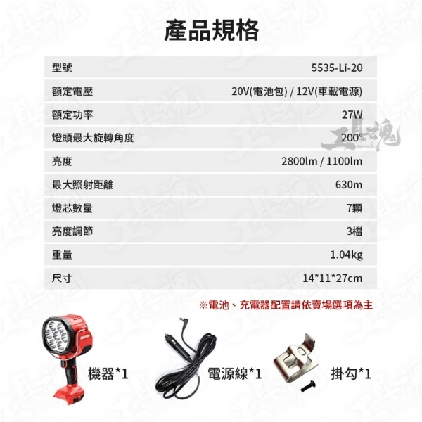 額定電壓:20V(電池包) / 12V(車載電源)