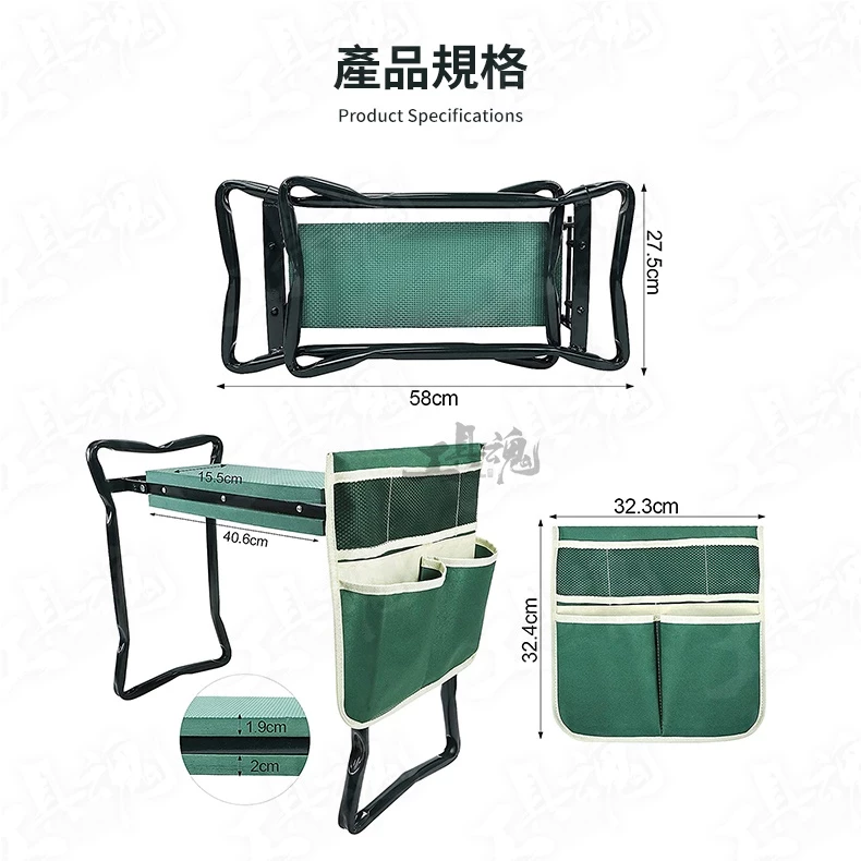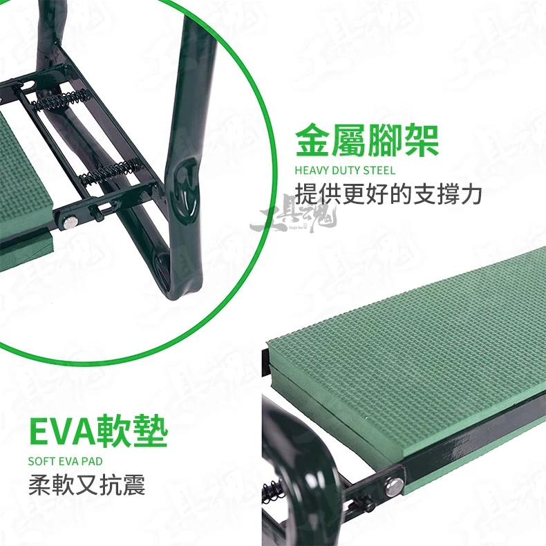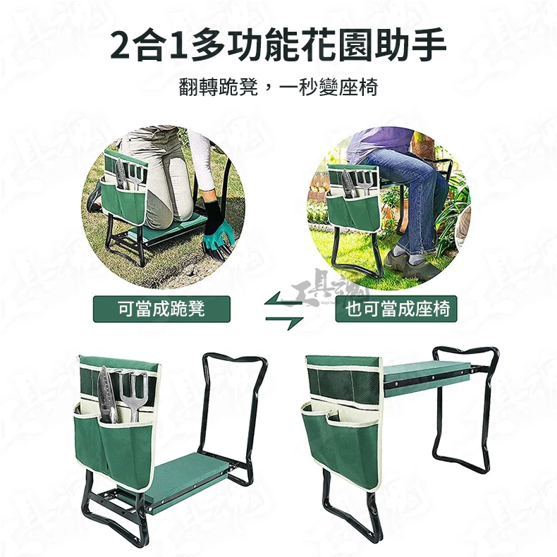 展開尺寸:60*27.5*48.5cm (長*寬*高) 收納尺寸:58*27.5cm (長*寬) 淨重:2.59 kg 工具包尺寸:32.3*32.4cm 袋深:19cm ❀耐用與高品質的材質➤使用EVA軟墊,可避免因長時間跪著而造成膝蓋負擔與傷害。 ❀2合1多功能花園助手➤可當成跪墊;也能翻轉過來當成座椅。 ❀方便的工具包➤工具包附贈四個口袋,在戶工作也不怕工具遺失,可拆式設計,清洗也非常容易。 ❀折疊式設計➤收納、攜帶都方便,一拎即走,輕巧無負擔。