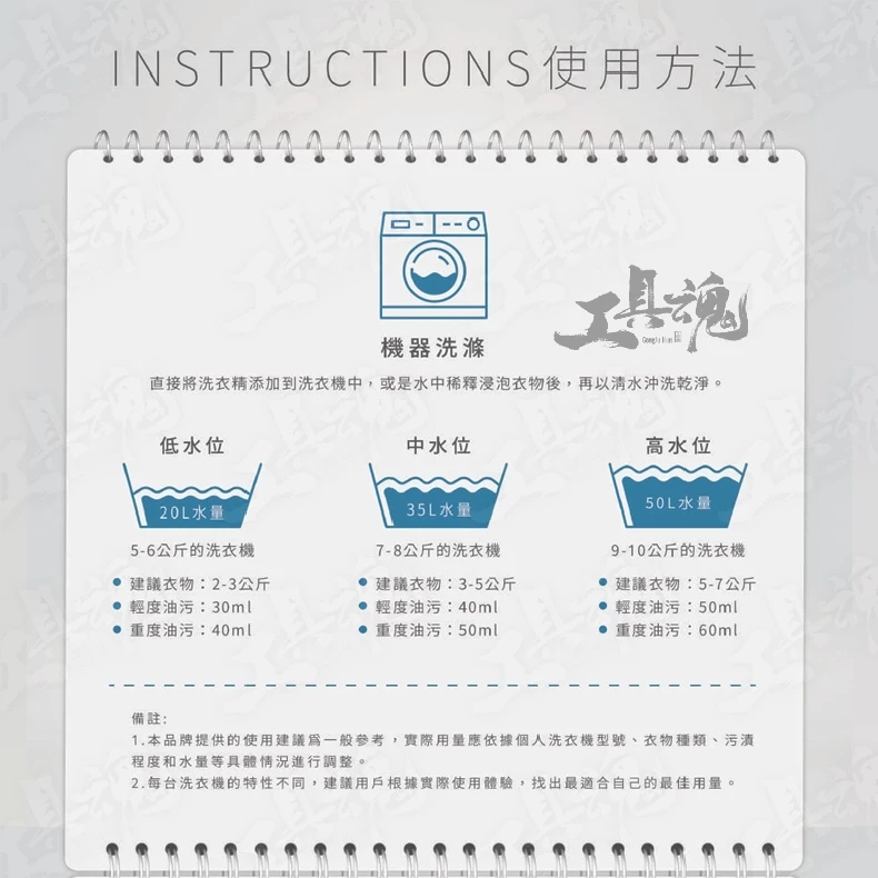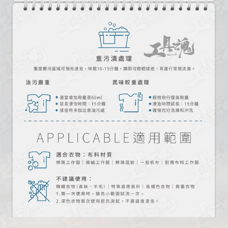 可根據工作環境的嚴苛程度,彈性搭配使用『專業強化|重油污洗衣精、專業除臭洗衣精』: