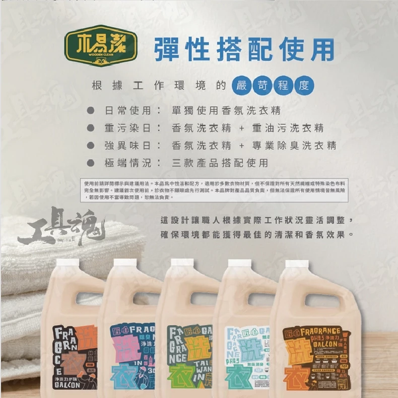 可根據工作環境的嚴苛程度,彈性搭配使用『專業強化|重油污洗衣精、專業除臭洗衣精』: