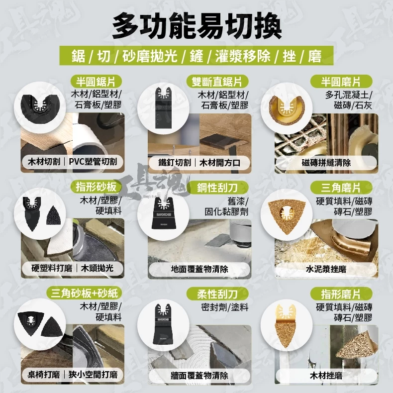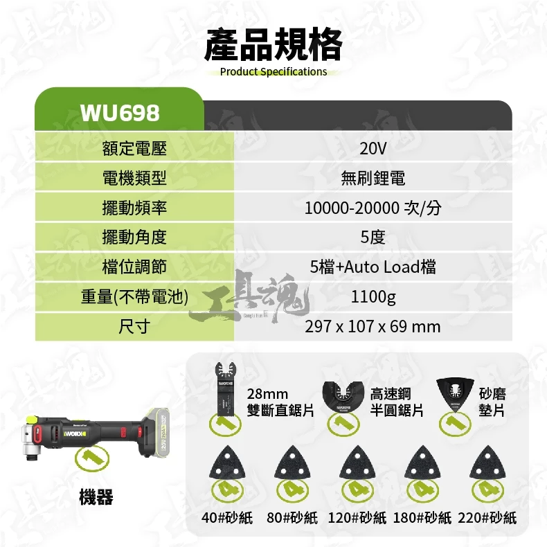 主機*1;28mm雙斷直鋸片*1;高速鋼半圓鋸片*1;砂磨墊片*1;40#、80#、120#、180#、220#砂紙各*4