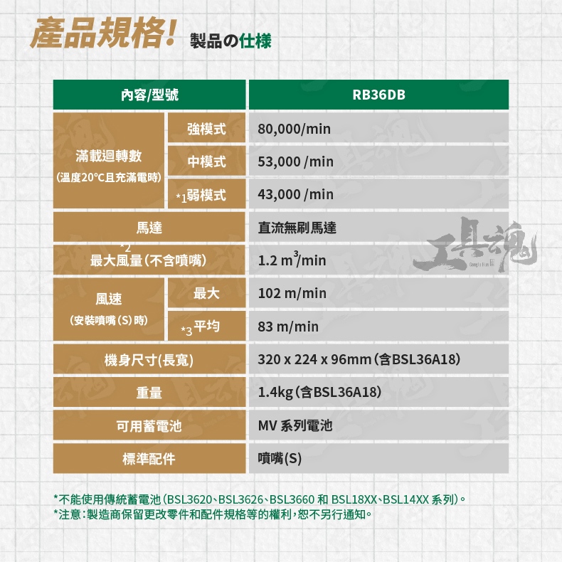 機身尺寸 (長x高x寬):320 x 224 x 96mm(計入BSL36A18電池)