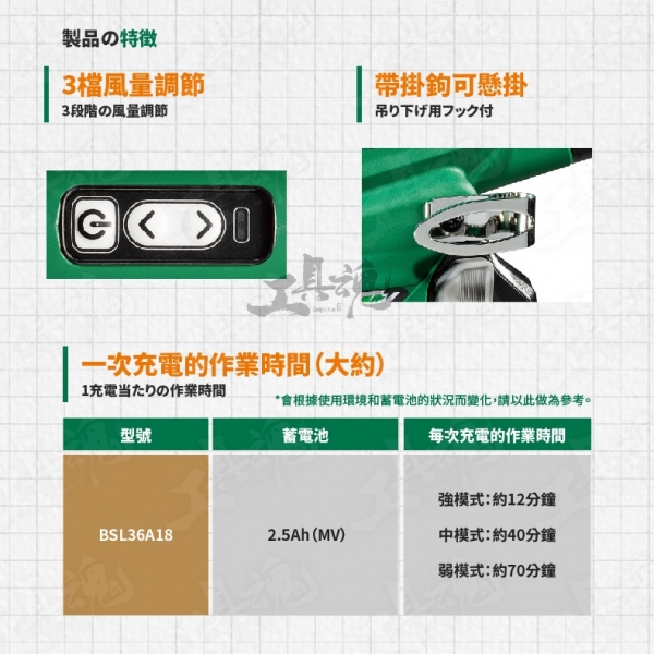 連續使用時間 (以BSL36A18 2.5Ah電池為例):