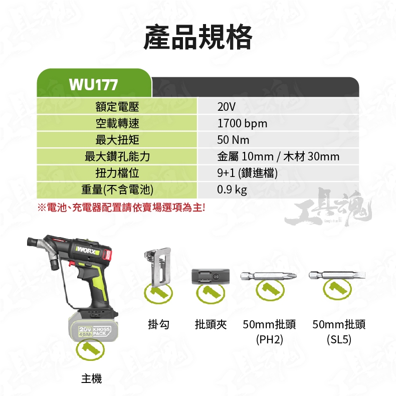 主機 x1、 掛勾 x1、批頭夾 x1、50mm批頭(PH2) x1、50mm批頭(SL5) x1