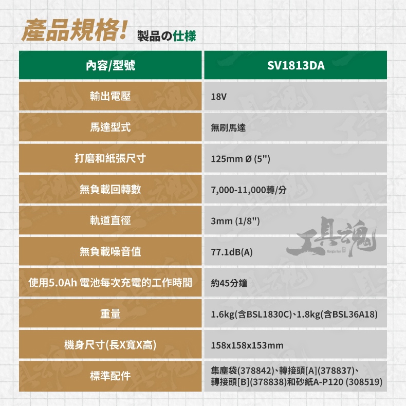 機身重量:1.6kg (搭配18V 3.0Ah薄型電池)