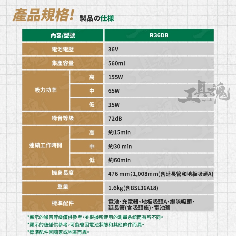 ■標準配件:電池BSL36A18,充電器、地板吸頭 、縫隙吸頭、延長管(含吸頭座)