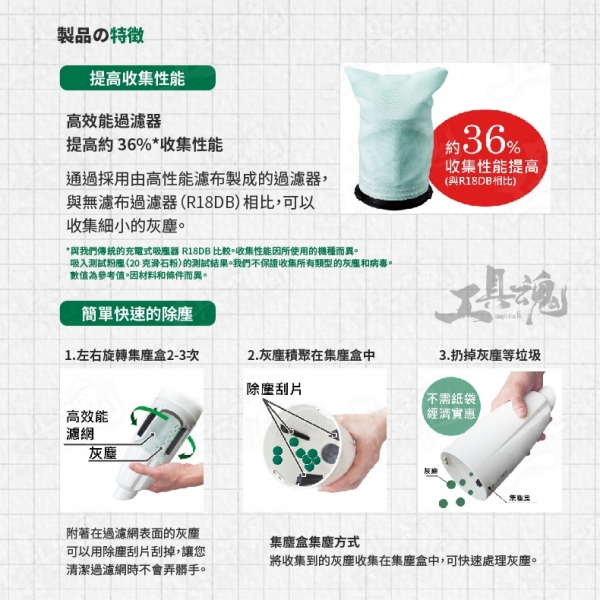 提高收集性能:高效能過濾器,提高約 36%*收集性能,通過採用由高性能濾布製成的過濾器,與無濾布過濾器(R18DB)相比,可以收集細小的灰塵。