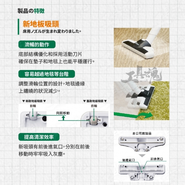 提高清潔效率:新吸頭有前後進氣口,分別在前後移動時牢牢吸入灰塵。
