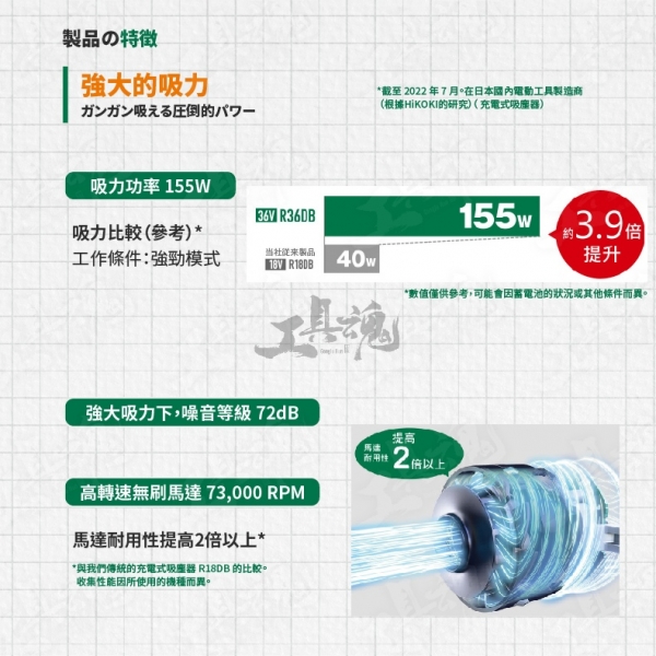 高轉速無刷馬達 73,000 RPM:馬達耐用性提高2倍以上