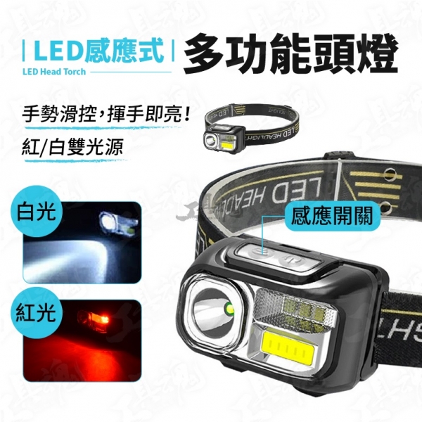 感應式 LED多功能頭燈 COB 探照燈 紅白雙光源 登山 夜釣 夜跑 揮手感應 LED燈 工作燈