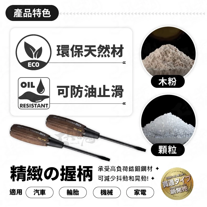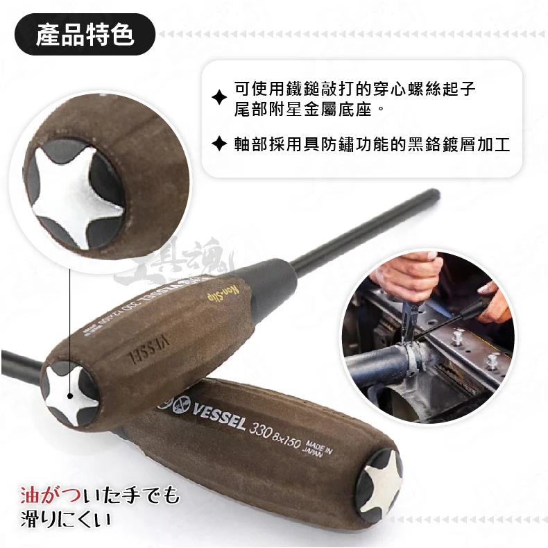◇ 可使用鐵鎚敲打的穿心螺絲起子。 尾部附星金屬底座。