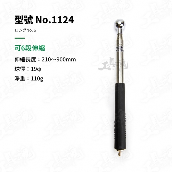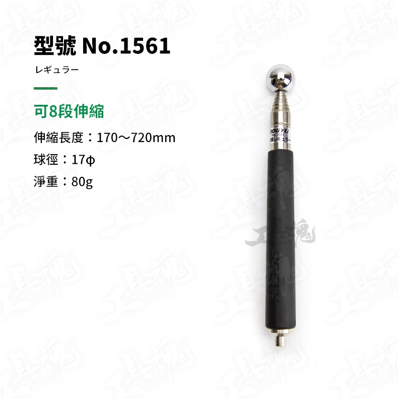 ●用於檢測磁磚是否空心或膨脹 ●長度可伸縮 #No.1124-可6段伸縮 伸縮長度:210~900mm 球徑:19φ 淨重:110g #No.1391-可8段伸縮 伸縮長度:210~1170mm 球徑:17φ 淨重:110g #No.1448-可9段伸縮 伸縮長度:250~1510mm 球徑:19φ 淨重:170g #No.1561-可8段伸縮 伸縮長度:170~720mm 球徑:17φ 淨重:80g