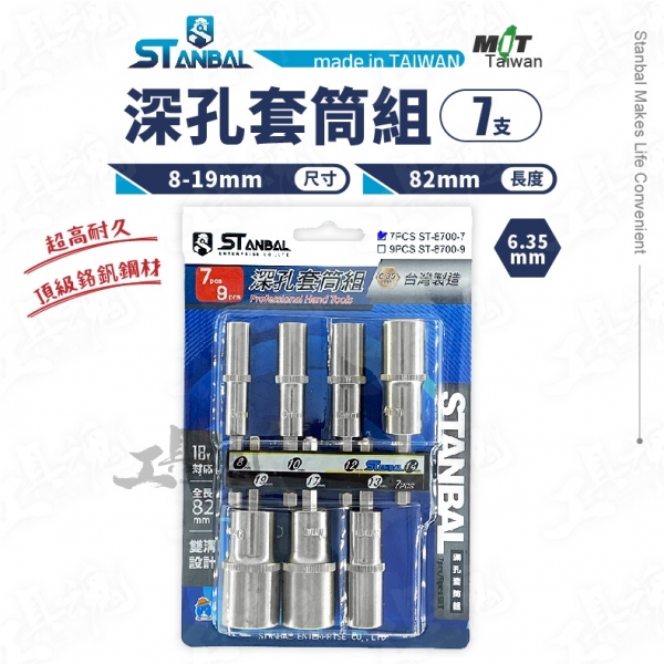 史丹堡- ST-8700-7 無磁深孔套筒 8-19mm 82mm 台灣製 六角軸