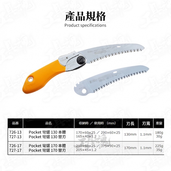 商品規格: 【726-13】 尺寸:290*60*25mm 刃長:130mm 刃寬:1.1mm 淨重:180g 【726-17】 尺寸:375*90*25mm 刃長:170mm 刃寬:1.2mm 淨重:225g