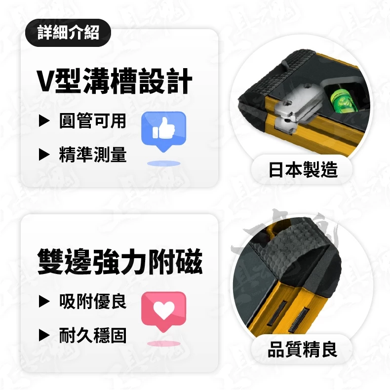 ‧ 帶有垂直、45°氣泡管,可水平測量、垂直測量、45°測量(※120mm無45°氣泡管)