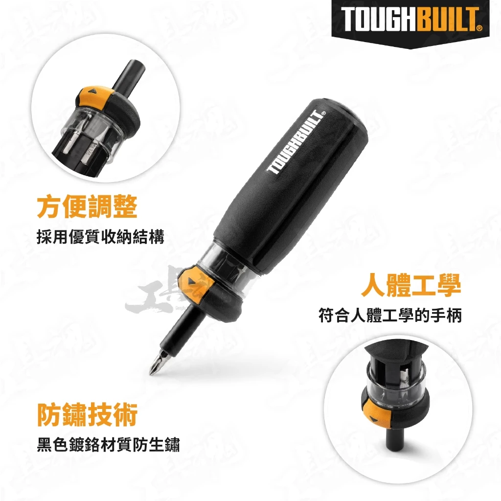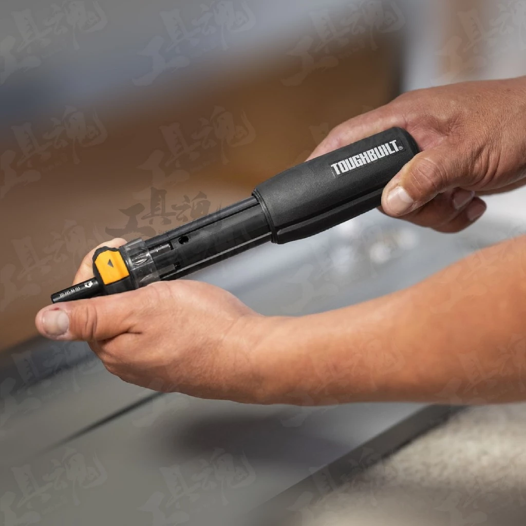 ✔️ToughBuilt 自動裝載多個起子頭是一款多功能套件,其 6 個起子頭存放在符合人體工學的手柄內。