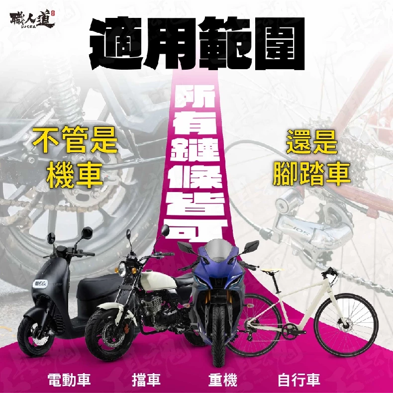 適用所有類型的車輛鏈條:自行車、重機、檔車、電動車、越野摩托車、沙灘車、卡丁車…等,以及各式設備機械、工具之鏈條清潔。