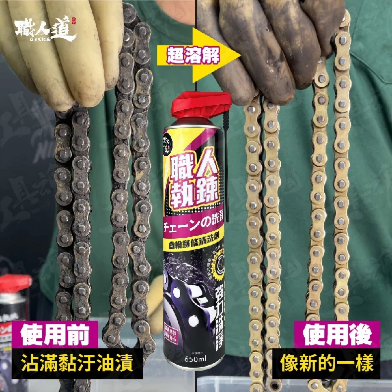超強滲透力分解油污、雜質,快速清潔無殘留。高效清除鏈條上膏狀雜質、塊狀堆積物,更可滲透至零件的極窄處與間隙中,360度清潔無死角,快速去污,等待時間短,立即見效。