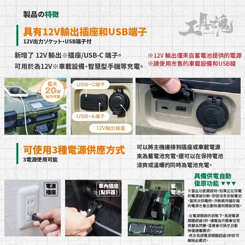 • 支援3種電源(鋰離子電池、AC家用電源變壓器、車載電源)。