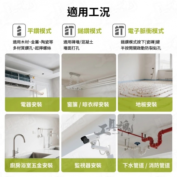 • 鑽孔效率佳:最佳鑽孔 6–10mm,最大可達 20mm,一般安裝工程綽綽有餘