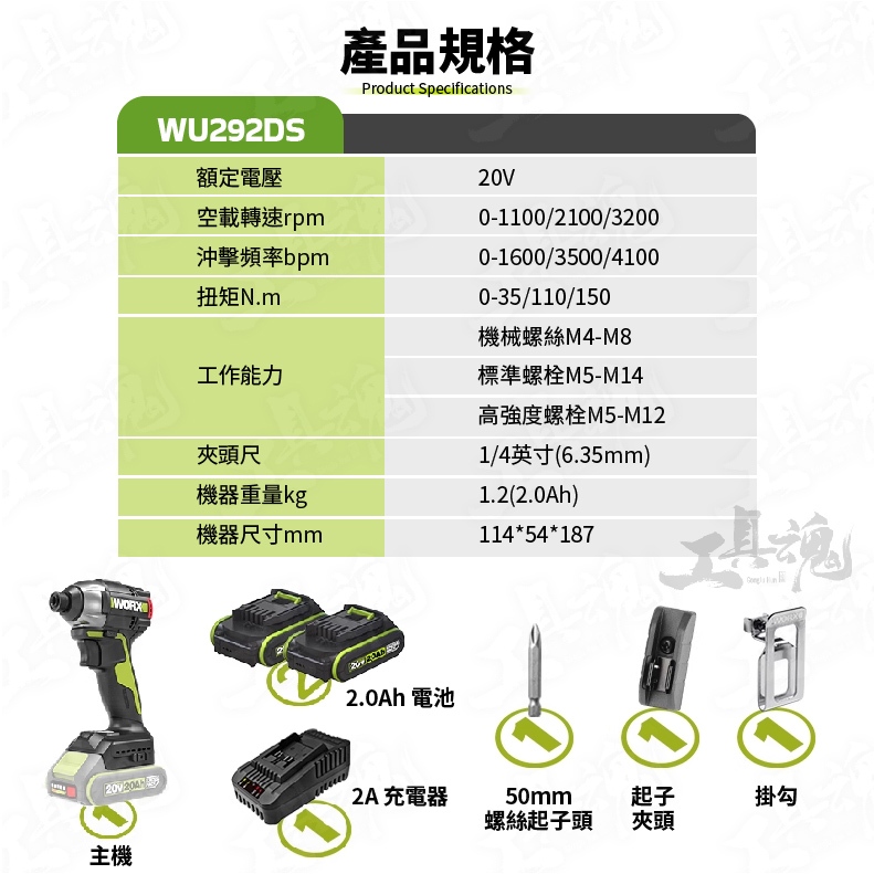 主機*1、2.0Ah電池*2、2A充電器*1、批頭*1、批頭夾*1、工具包*1、使用說明書*1、保修卡*1