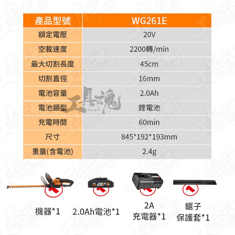 主機*1、2.0Ah電池*1、2A充電器*1、鋸子保護套*1、使用說明書*1、保修卡*1