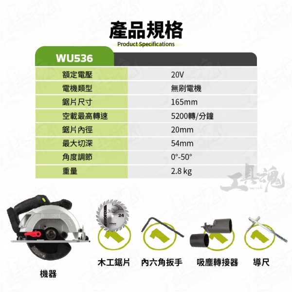 主機*1、內六角扳手*1、165mm鋸片*1、吸塵器導管*1、平行導尺*1、使用說明書*1、保修卡*1