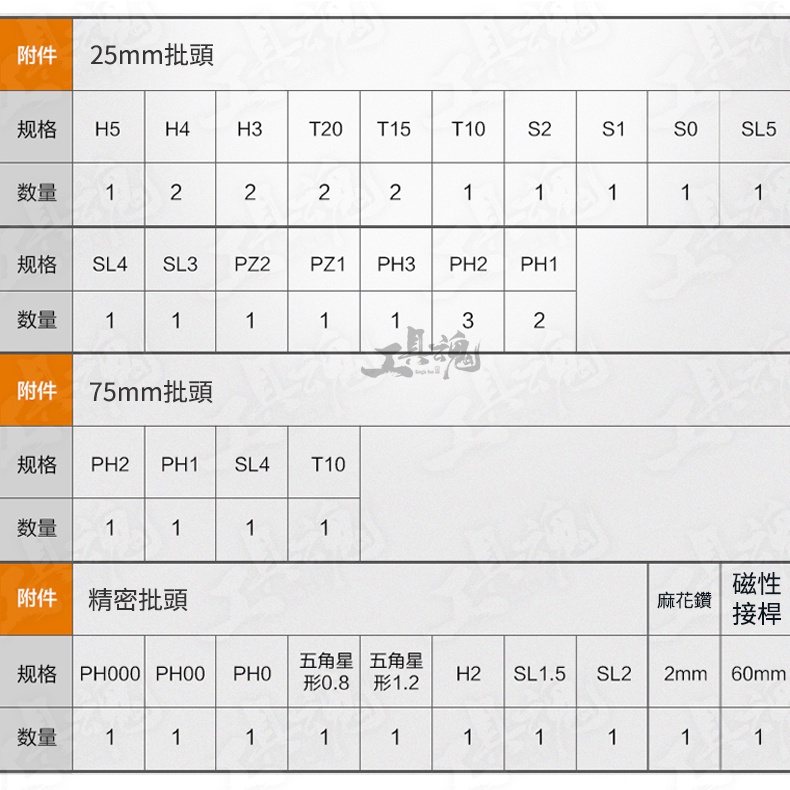 主機*1、螺絲起子頭*30、USB充電線*1、說明書*1