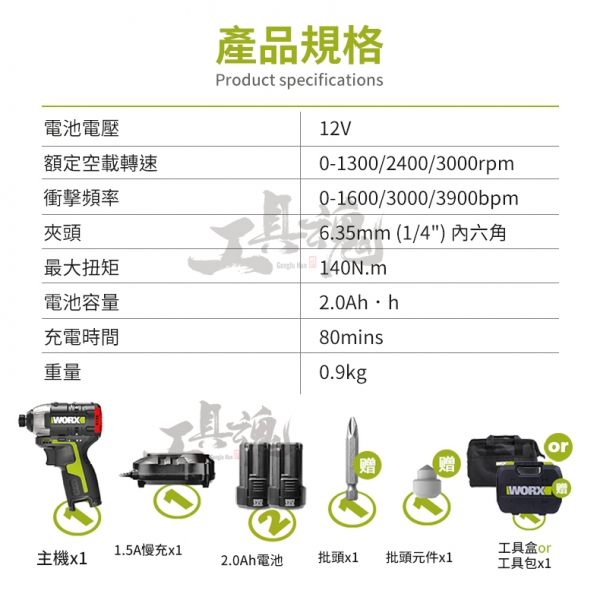 主機*1、2.0Ah電池*2、1.5A充電器*1、批頭*1、批頭元件*1、工具盒*1、使用說明書*1、保修卡*1