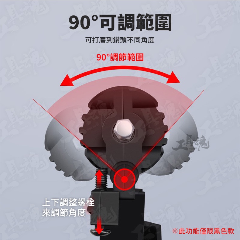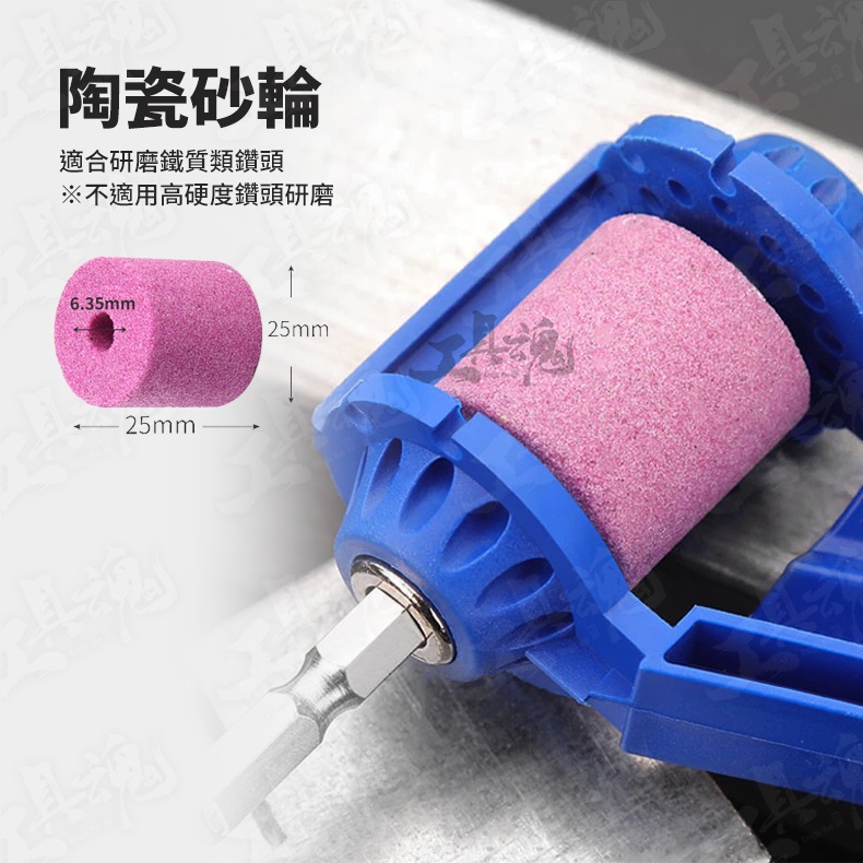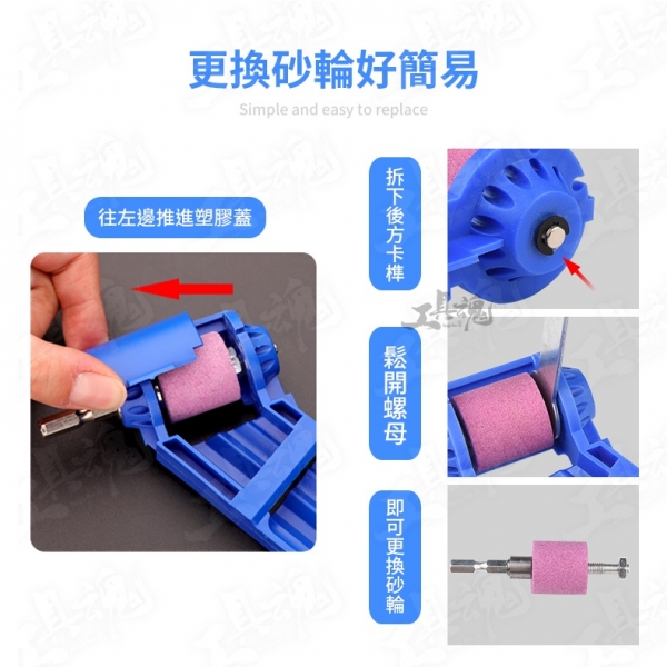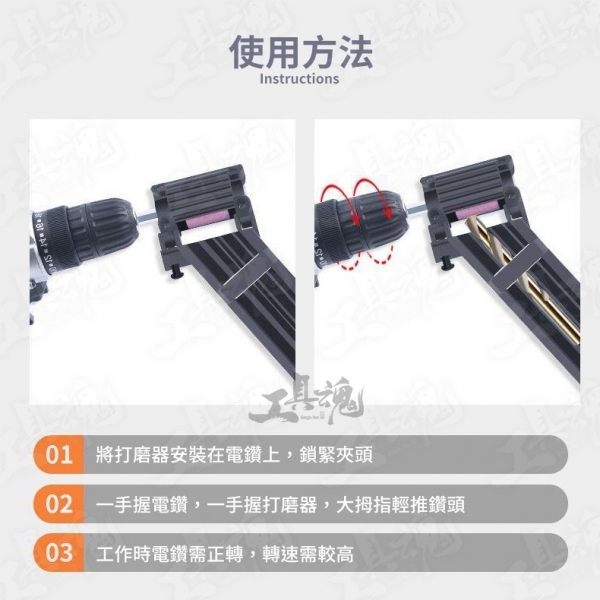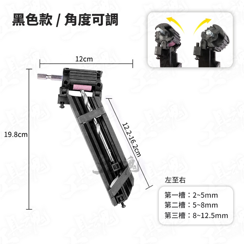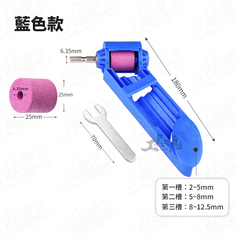 ※不建議用來打磨高硬度鑽頭 【藍色基本款】 內六角6.35mm 尺寸:180mm*80mm(加鑽頭) 鑽頭放置尺寸: 第一槽 / 2~5mm 第二槽 / 5~8mm 第三槽 / 8~12.5mm 【黑色款 / 可調角度】 內六角6.35mm 尺寸:198mm*120mm(加鑽頭) 鑽頭放置尺寸: 第一槽 / 2~5mm 第二槽 / 5~8mm 第三槽 / 8~12.5mm 頭部可調範圍:90° 可打磨不同角度鑽頭,打磨更全面! 【使用說明】 1.將打磨器安裝在電鑽上,鎖緊夾頭 2.一手握電鑽,一手握打磨器,大拇指輕推鑽頭 3.工作時電鑽需正轉,轉速需較高