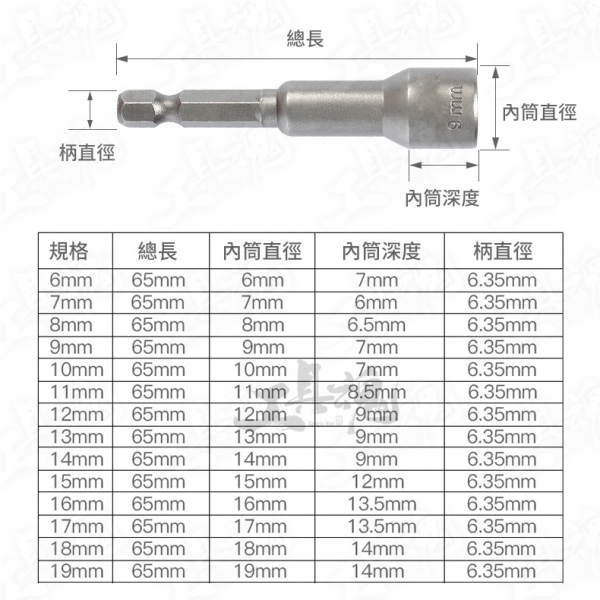 鉻釩剛強磁套筒 【尺寸選擇】 6mm / 7mm / 8mm / 9mm / 10mm / 11mm / 12mm / 13mm / 14mm / 15mm / 16mm / 17mm / 18mm / 19mm