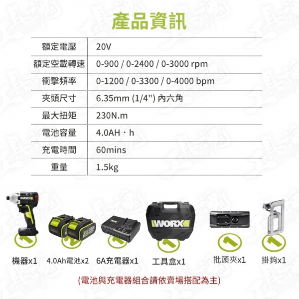 主機*1、4.0Ah電池*2、6A充電器*1、工具箱*1、批頭夾*1、掛鉤*1、使用說明書*1、保修卡*1