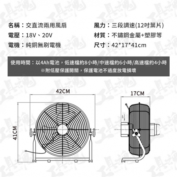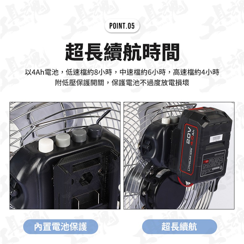 使用時間:以4Ah電池,低速檔約8小時/中速檔約6小時/高速檔約4小時