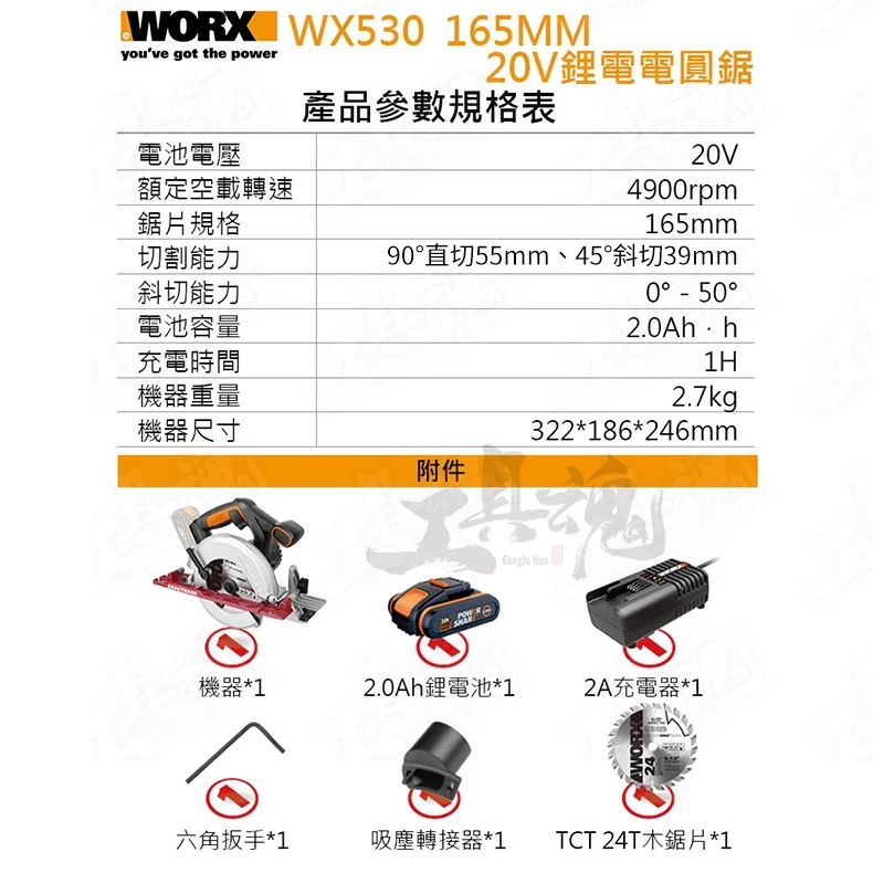 主機*1、2.0Ah電池*1、2A充電器*1、六角扳手*1、吸塵轉接器*1、TCT 24T木鋸片*1、使用說明書*1、保修卡*1