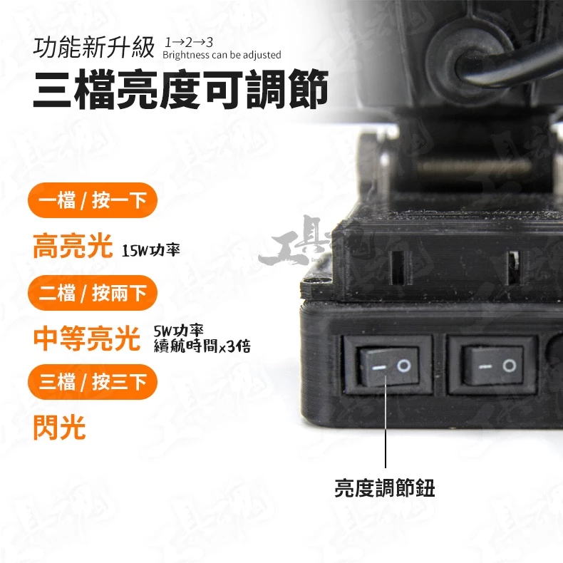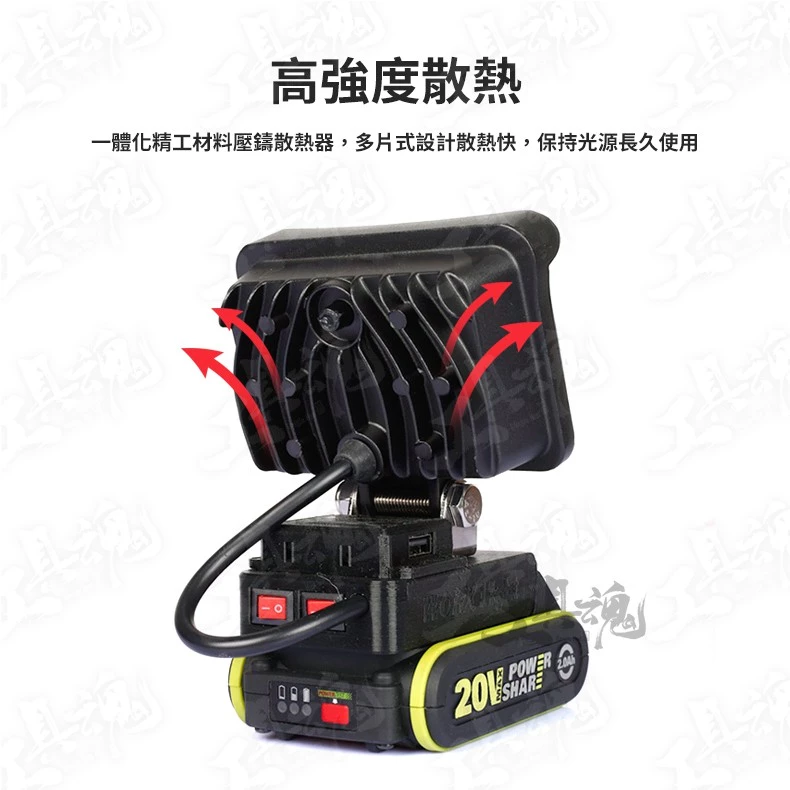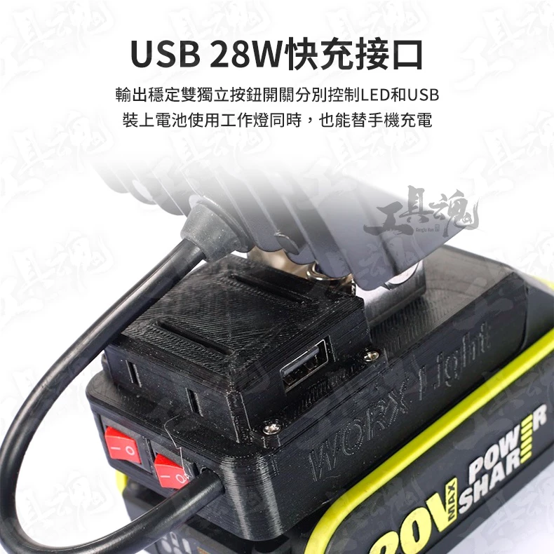 ※本商品不包含電池 ※USB接口不可直接用來啟動工作燈,還是需要裝上電池才能啟動工作燈唷 ※USB接口的功用為:裝上電池使用工作燈同時,也能替手機充電 【產品規格】 燈珠:22顆 亮度:2400LM 功率:第一段,15W(4.0Ah電池約可運作5小時) / 第二段,5W(續航時間為3倍) / 第三段,閃光 底座材質:3D列印 燈外殼材質:鋁合金 底座輸出保護電壓:15V 待機電流:10MA 【USB快充參數】 輸出電壓:預設5V,開始快充後在3.12V之間自動調整 輸出功率:(24W(5V@3.4A,9V@2.5A,12V@2A等) 轉化效率:90%-97% ※此賣場提供 "有USB充電孔"及"無USB充電孔" 兩種款式的工作燈 【商品特色】 ✓三段式亮度可度調節 ✓輸入過流保護 / 輸入過壓、欠壓保護 / 整機過溫保護 / 輸出過流、短路保護 ✓3D列印底座,環保又堅固 ✓可調節轉軸支架 ✓聚光LED燈珠 ✓USB 28W快充接口 ✓雙獨立開關,分別控制LED光源和USB供電 ✓高強度散熱,一體化加厚散熱器