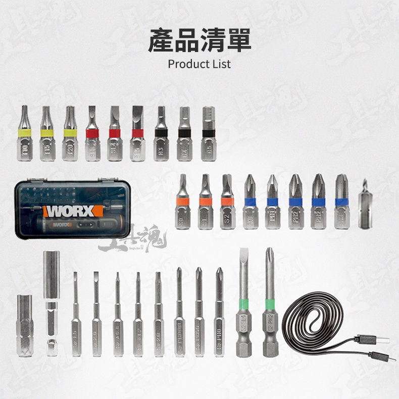 主機*1、螺絲起子頭*30、USB充電線*1、說明書*1