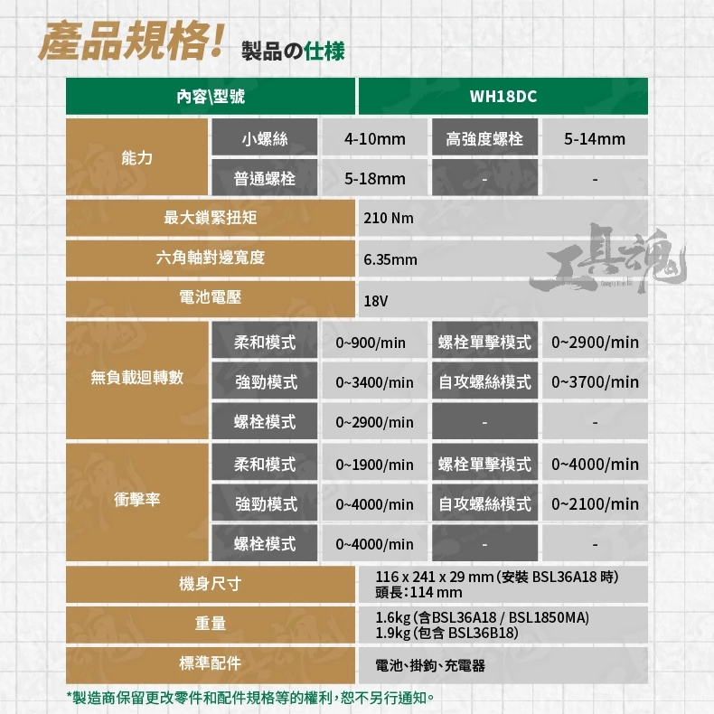 重量:1.6kg(含BSL36A18/BSL1850MA);1.9kg(包含BSL36B18)