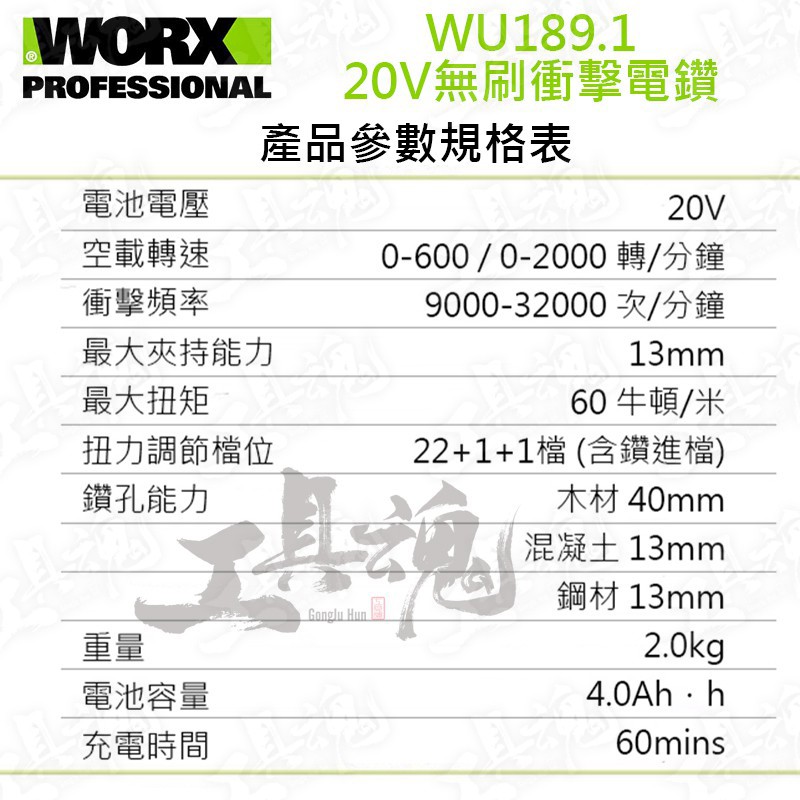 品名:20V鋰電池衝擊電鑽套裝 (WU189+WU294組合)