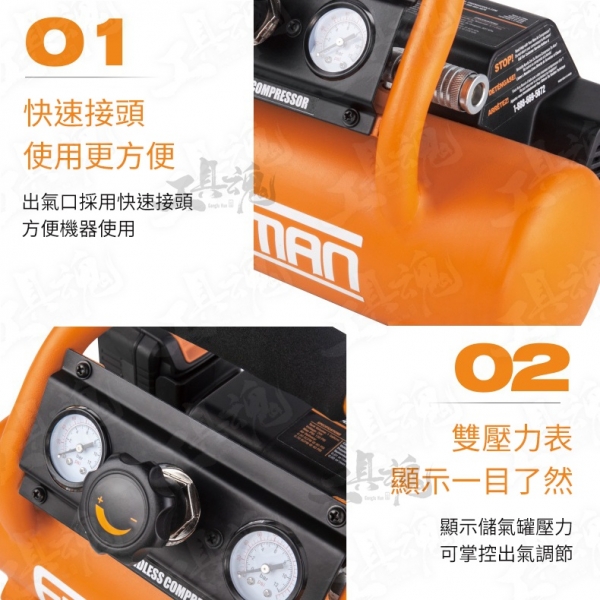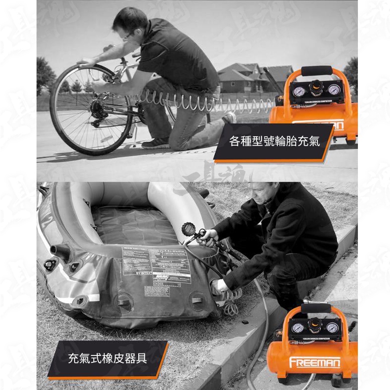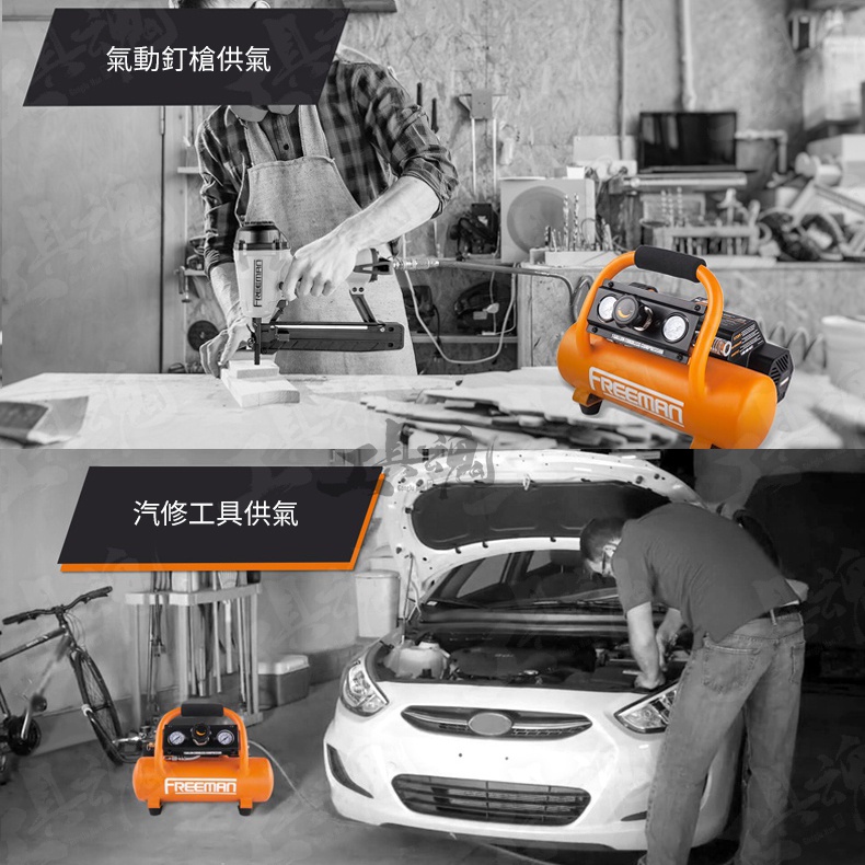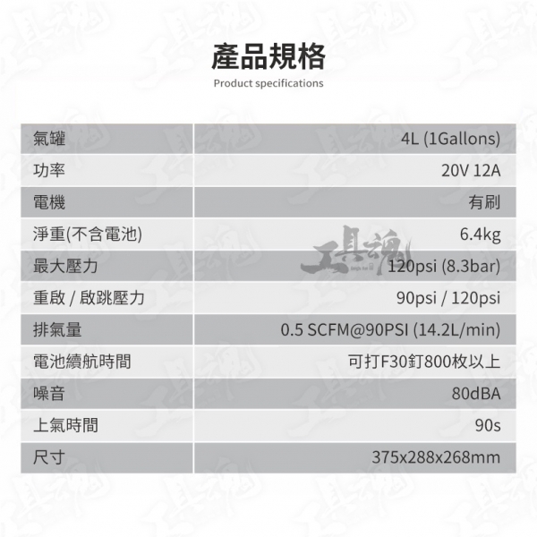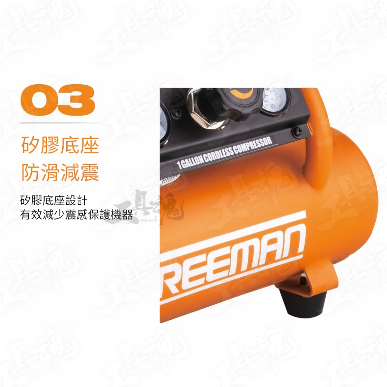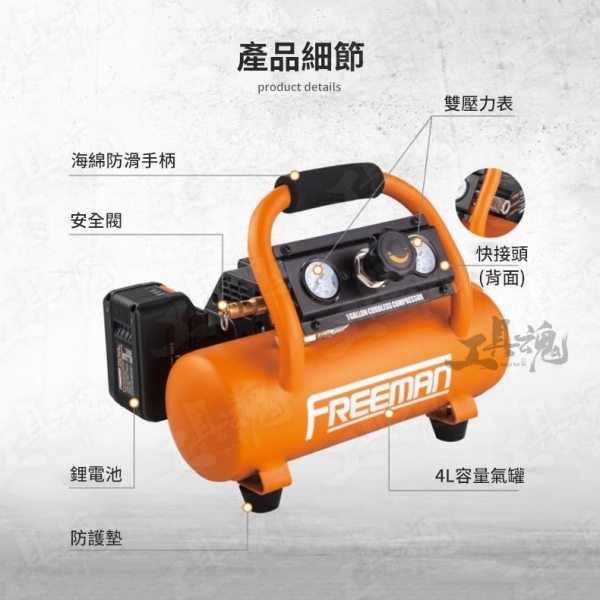 FREEMAN 為美國專業工具品牌 品牌:FREEMAN 品名:4L鋰電打氣機 《商品標配》 主機*1、使用說明書*1、保修卡*1 《商品保固》 原廠保固時間為6個月 《商品規格》 氣罐:4L (1Gallons) 功率:20V 12A 電機:有刷 淨重(不含電池):6.4kg 最大壓力:120psi (8.3bar) 重啟 / 啟跳壓力:90psi / 120psi 排氣量:0.5 SCFM@90PSI (14.2L/min) 電池續航時間:可打F30釘800枚以上 噪音:80dBA 上氣時間:90s 尺寸:375x288x268mm