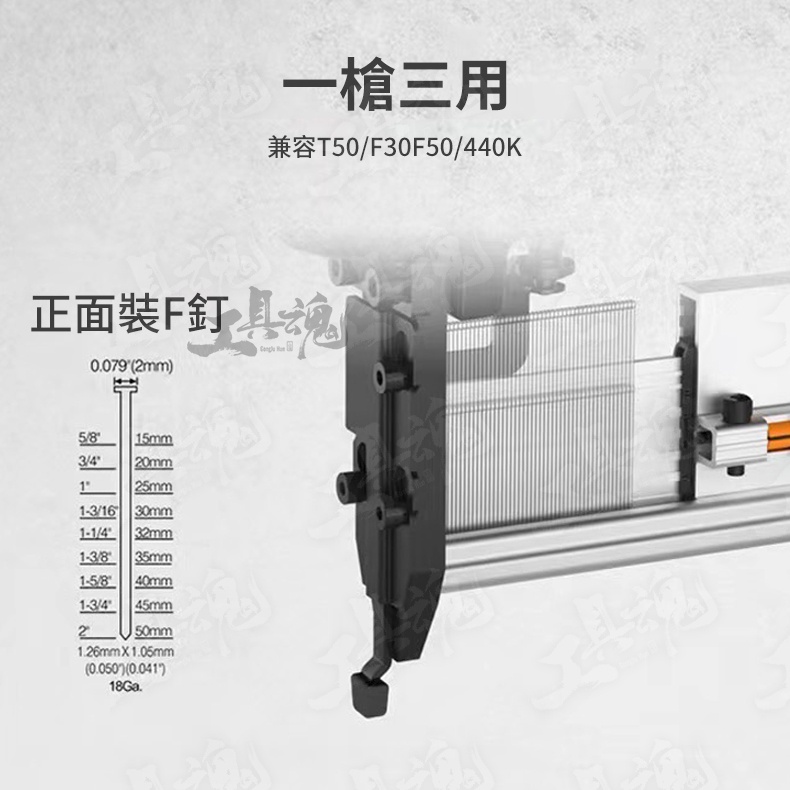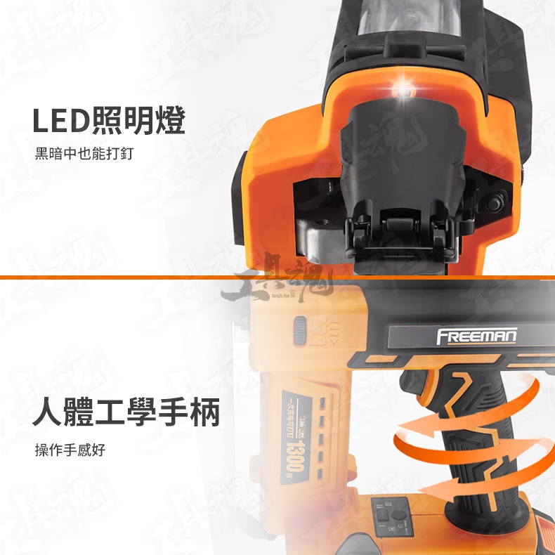 FREEMAN 為美國專業工具品牌 品牌:FREEMAN 品名:三合一鋰電釘槍 《商品標配》 主機*1、使用說明書*1、保修卡*1 《商品保固》 原廠保固時間為6個月 《商品規格》 型號:LDT50/440K/F30F50 外型尺寸:318*115*285mm 釘子類型:F、T、K 釘子長度範圍(mm): F15-F20-F25-F30-F32-F38-F40-F50 419K-425K-432K-438K-440K T25-T32-T38-T50 彈匣容量:100 電源:18-20V鋰電池 配置:裸機*1 打釘頻率:1秒2次 打釘枚數:1300(2.0Ah) / 2600(4.0Ah) 淨重:3.0kg 《商品特色》 √三合一釘槍 √單連發一鍵轉換 √可調整打釘深度 √打釘效率高,一秒可釘2枚 √一次充電可釘2600枚 √快拆槍嘴,卡釘也好清理 √整體造型符合人體工學,手柄舒適好握持