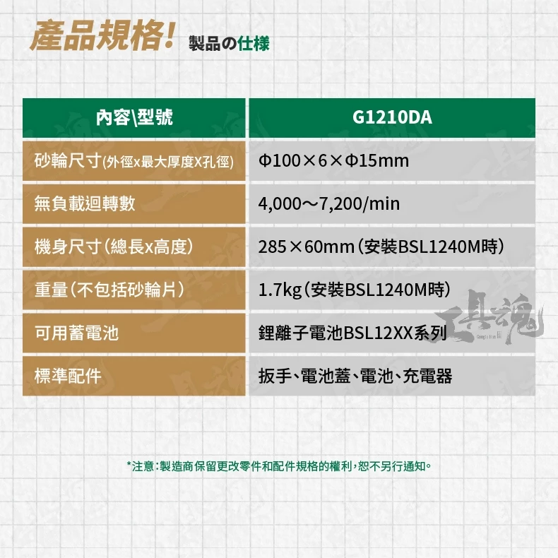 HiKOKI 12V 可調速速停砂輪機 (不含砂輪片)