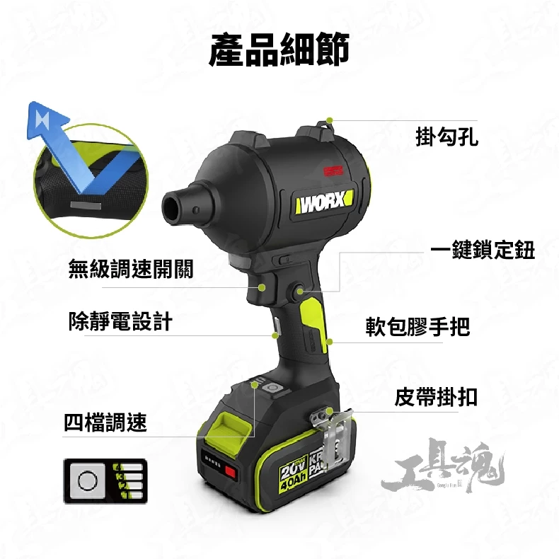 主機*1、9mm噴嘴*1、13mm噴嘴*1、長噴嘴*1、夾閥噴嘴*1、WA1707抽氣套裝*1