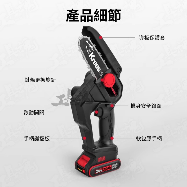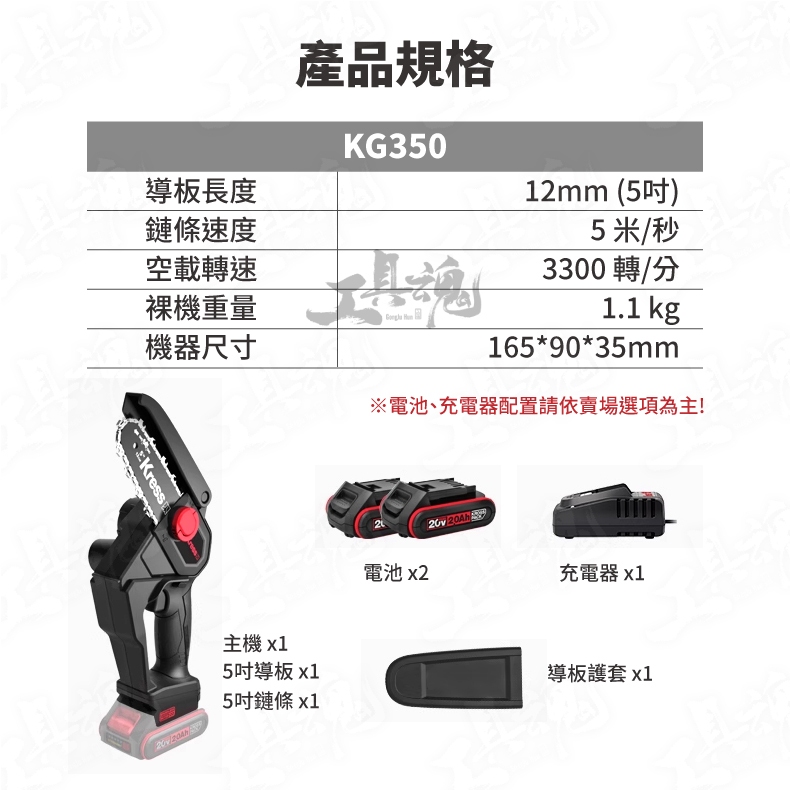 主機*1、5吋導板*1、5吋鏈條*1、電池*2、電器*1、導板護套*1、使用說明書*1、保修卡*1