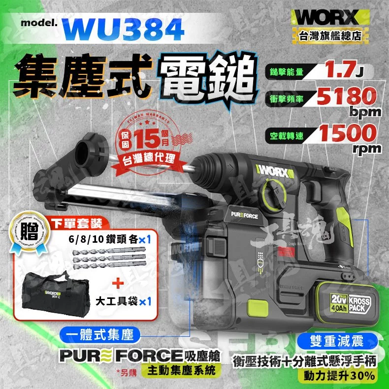 • PURE FORCE 主動集塵系統:可搭配 WA1603 集塵盒,鑽孔同步吸塵