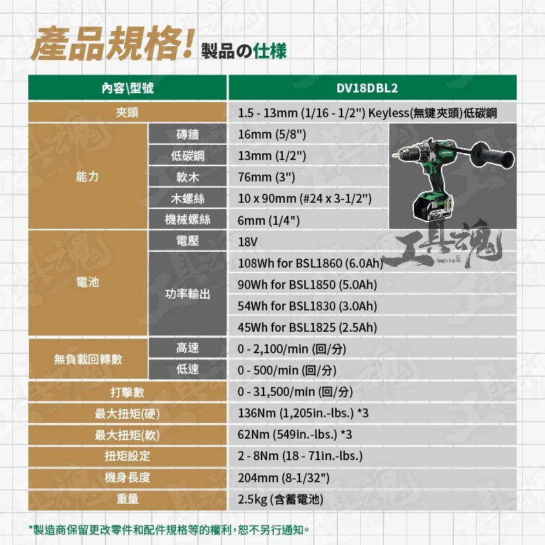 夾頭:1.5 - 13mm (1/16 - 1/2") Keyless(無鍵夾頭)