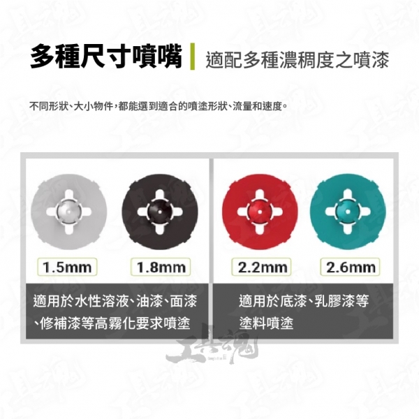 1.5mm噴嘴*1、1.8mm噴嘴*1、2.2mm噴嘴*1、2.6mm噴嘴*1