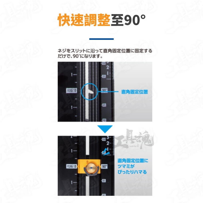 ◆滑塊移至直角固定位置,固定螺絲,即可快速調整至90°